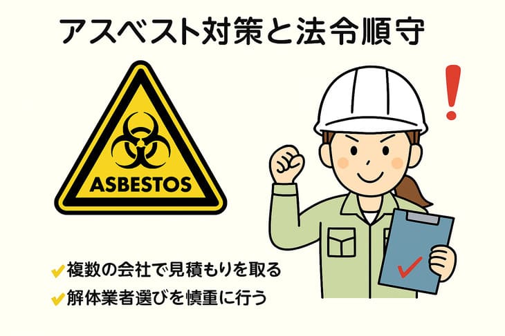 違法回収(無許可の軽トラック回収など)に渡すと、不法投棄の連帯責任や保険の減額につながるおそれがあります。また、屋根材や古い建材にはアスベスト含有の可能性があるため、事前調査結果に従い、除去・封じ込めなどを専門業者が実施します。