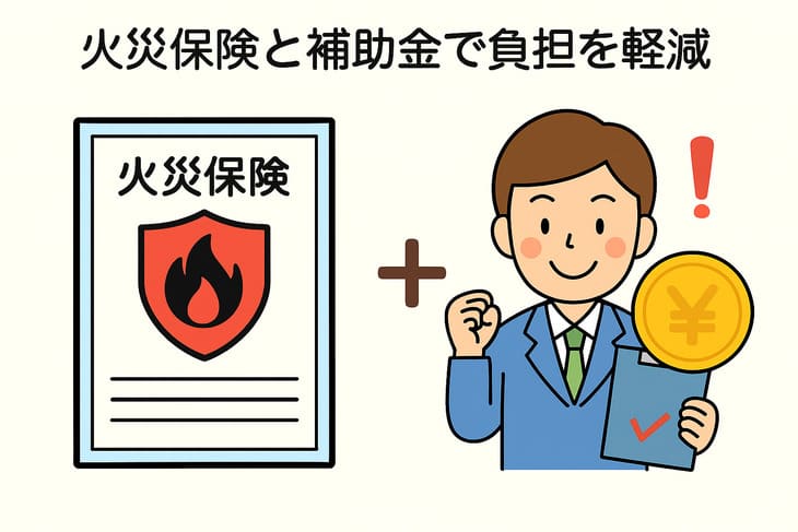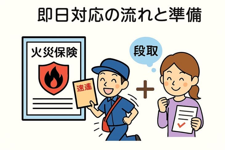 火災保険(住宅総合保険や家財保険等)を契約している場合は、早期の事故連絡が重要です。保険会社(または代理店)に連絡し、事故受付番号・担当者・損害鑑定人の訪問予定を確認し、査定が終わるまで原則として処分・解体を行わないようにします。