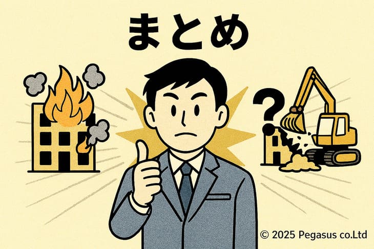 火災(火事)直後に解体工事をいつ・どう進めるかで、時間と費用、保険金の受け取りが大きく変わります。本記事は東京都(23区・多摩地域)の実務に即し、手続きや費用相場、保険適用、段取りを一読で把握できます。具体的には、東京消防庁の調査後の初動、罹災証明書の取得、保険・共済の適用範囲と申請、アスベスト(石綿)事前調査、建設リサイクル法の届出、道路使用・占用許可、仮囲い・養生の計画、ライフライン停止(東京電力・東京ガス・東京都水道局・NTT)、滅失登記、産業廃棄物マニフェスト、費用の内訳と火災特有の追加費(残置物処分など)、見積り比較と業者選び、密集市街地の安全対策、防火地域・接道制限まで網羅します。結論として、証拠保全と罹災証明、保険会社の同意を先に確実化し、必要届出を完了させてから相見積もりで適正価格かつ解体工事業登録・収集運搬許可・賠償責任保険が整った業者に発注することが、最短で損失を抑える最善策です。失火責任法や類焼損害の考え方、近隣対応の実務も解説し、固定資産税の減免、再建築不可・セットバックの確認、更地渡しや土地売却、地中埋設物・土壌汚染への対応、近隣挨拶や工事看板の要点まで触れます。