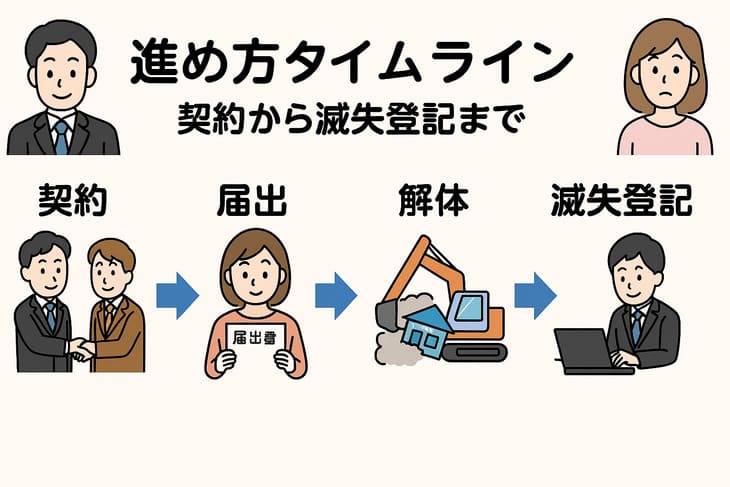 解体完了後は「建物滅失登記」と「家屋滅失の申告」を速やかに行い、翌年1月1日時点の反映を意識して日程逆算することが肝心です。